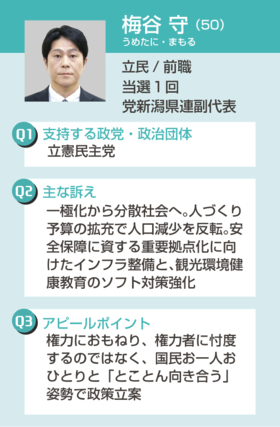 衆議院選挙が10月15日公示され、新潟5区には前職2人が立候補しました。立候補したのは、届け出順に、立憲民主党・前職の梅谷守さん(50)、自民党・前職の高鳥修一さん(64)です。投票日は27日で、その日のうちに開票されます。