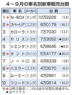 経済 2024年度上半期の国内新車販売台数、ホンダ「N-BOX」が3年連続首位 2位はスズキ「スペーシア」 2024/10/19 17:00 2024年度上半期(4〜9月)の車名別の国内新車販売台数は、ホンダの軽自動車「N-BOX(エヌボックス)」が前年同期比1・8%増の10万2226台と、3年連続で首位だった。日本自動車販売協会連合会と... 残り305文字(全文:405文字) ここから先を読むには 続きを読む(会員登録する) 続きを読む(ログイン) 新潟日報朝刊を購読していますか? はい いいえ トップページで最新情報を見る 関連ニュース 新潟県内7月の新車登録、7カ月ぶり増加 ダイハツ工業生産再開... 2024/8/23 新潟県内2024年上半期の新車登録・届け出台数、11・7%減... 2024/8/15 お土産に「佐渡牛乳ガレット」いかが?佐渡乳業の牛乳使用、パッ... 11:30 異業種連携で新会社、五泉市でネット事業 NCT・越後天然ガス... 10:30 トランプ関税影響これからか…価格転嫁は「横にらみ」、AIRM... 10:00 積雪地域に対応!地面に垂直設置の太陽光発電設備、燕市で発電開... 1/21 生成AIで地域課題解決へ、新潟日報社と信濃毎日新聞社(長野市... 1/21 人手不足の物流業界、軽油の暫定税率廃止など好材料も…県トラッ... 1/21 定点カメラ80台の映像から選んで視聴、“待ち時間”解消!ケー... 1/21 サツマイモとリンゴの甘~い香り♡ウオロクが児童考案ピザを限定... 1/21 大光銀行、ATM手数料を「全時間無料」へ 4月1日から平休... 1/20 塩沢つむぎ記念館(南魚沼市)が事業譲渡、湯沢町の観光業社co... 1/20