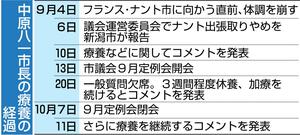 中原市長は9月4日、フランス・ナント市へ向かう直前、都内で体調を崩した。9月下旬に3週間程度で復帰する意向を示していたが症状が改善せず、10月11日、療養をさらに継続するとのコメントを発表。その中で「登庁再開の時期を申し上...