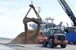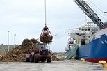 穴水港で行われた、木くずの積み込み作業=10月19日午前、石川県穴水町