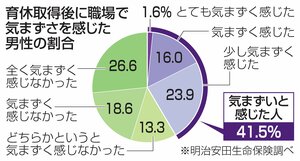 社会 育休取得後「職場で気まずい」男性は41・5%…同僚の負担増を懸念 会社に望む制度は「人員の補充」など 2024/10/27 10:30 育休取得後に職場で気まずいと感じた男性は41・5%-。明治安田生命保険が実施したアンケートで、こんな実態が浮かんだ。気まずさの背景には、同僚の仕事の負荷が高まることへの懸念があり、気兼ねなく育休を取得するには... 残り489文字(全文:594文字) ここから先を読むには 続きを読む(会員登録する) 続きを読む(ログイン) 新潟日報朝刊を購読していますか? はい いいえ トップページで最新情報を見る 関連ニュース 男性の育休取得率、初の30%超え!取得期間も長期化・厚生労働... 2024/8/1 「パパの育休」を当たり前に!新潟県の民間事業所、男性の育休取... 2024/4/11 “サンタ”や“トナカイ”がダイビング♪佐渡市琴浦沖で一足早い... 13:10 [クマ目撃情報]五泉市(11月10日) 随時更新 12:10 沖縄の慰霊碑「新潟の塔」に舞うチョウと亡き父重ね…三条市の姉... 11:40 長岡市で走行中の車にイノシシ衝突 8:59 [鉄道運行情報]トキ鉄直江津-妙高高原の一部区間で運休、大雨... 8:08 上越新幹線で異音、一時運転見合わせ 約6400人に影響 11/9 JR信越線で車掌が体調不良訴え搬送、運休で約120人に影響 11/9 [新潟県の天気・気象情報]11月10日夕方にかけて大雨、突風... 11/9 [地震情報・新潟]岩手、宮城で震度4 新潟市や村上市など震度... 11/9 「柿食べて鍵かけて」…佐渡署などが特産おけさ柿配り防犯啓発 11/9