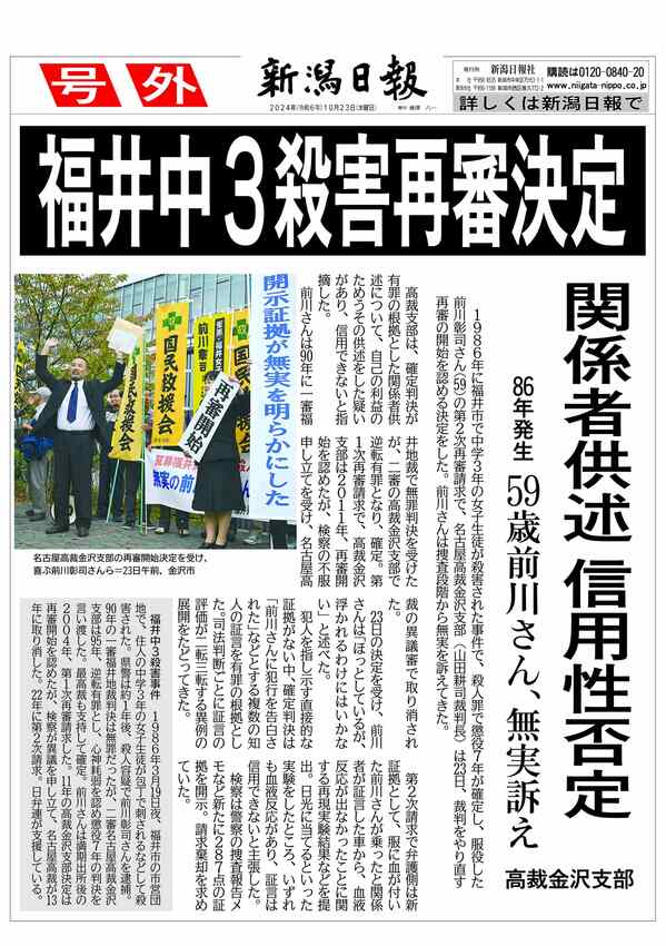 【号外】福井中3殺害で再審決定 2024/10/23 11:45 (最終更新: 2024/10/23 11:55) PDFで号外を見る トップページで最新情報を見る 関連ニュース 【長岡住宅強盗】刃物持った男、家の裏口から侵入か 防犯カメラ... 1/14 長岡市の80代女性から200万円だまし取った疑い、住所不定の... 1/14 後輩警察官に「死ね」などと暴言、脅迫容疑で書類送検の50代警... 1/14 柏崎市消防署の訓練中死亡事故、県警が業務上過失致死の疑いで消... 1/14 母親の首絞め殺人罪の被告、病死で公訴棄却・新潟地裁 1/14 妻の首を絞めて殺害しようとした疑い、長岡市の29歳会社員の男を逮捕 1/14 公園で猫なでるふりして女子児童の胸触ったか…新潟市東区の55... 1/14 柏崎市の消防士死亡事故 県警が当時の訓練責任者を書類送検へ、... 1/14 「ビジネスメール詐欺」被害は十日町の第三セクター・松代総合開... 1/13 新潟市西区の県道で路線バスがブレーキ 乗客の女性が転倒しけが 1/13 20代男性に性的暴行加えたか…岩手県の地方公務員の男逮捕、不... 1/13 新潟県などの顧客被害16億円超か 健康器具預託で現金詐取疑い... 1/13