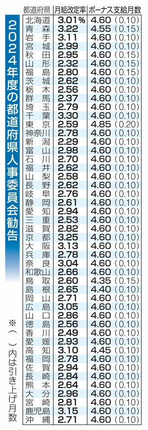 政治・行政 全都道府県で職員給与引き上げへ、人事委員会が勧告 平均改定率は10道府県で3%超、最小は新潟の2・29% 2024/10/27 13:30 都道府県職員の2024年度給与改定に関する人事委員会の勧告が10月22日、出そろった。共同通信の集計では、3年連続で全都道府県が月給とボーナス(期末・勤勉手当)両方の引き上げを求めた。月給の平均改定率は... 残り555文字(全文:657文字) ここから先を読むには 続きを読む(会員登録する) 続きを読む(ログイン) 新潟日報朝刊を購読していますか? はい いいえ トップページで最新情報を見る 関連ニュース 【新潟市2026年度予算案】8区の主な事業は?直接配分142... 13:00 村上市の統合保育園、事業者撤退で再公募へ 建築費高騰などで、... 12:30 2月県議会開会 強い経済へ花角知事「成長の基盤築く」県版Go... 2/24 高市首相事務所、自民議員にカタログギフト配布 数万円相当、衆... 2/24 「候補者や自治体に申し訳なかった」高市首相が真冬・超短期決戦... 2/24 阿賀町の神田町長が公務に復帰、胆のう摘出手術を経て「経過は順調」 2/24 新潟県内で初!関川村で「ごみ屋敷」条例成立「不良な生活環境の... 2/24 県議会2月定例会、「成長投資」の県予算案議論 花角英世知事の... 2/23 小千谷市、豪雪災害対策本部→雪害警戒本部に移行 融雪災害に警戒 2/22 妙高市特別職報酬等審議会、市長や議員らの報酬引き上げ答申 市... 2/22 五泉市特別職報酬等審議会、市長や議員らの報酬引き上げ答申 2... 2/22 【阿賀野市2026年度予算案】4.5%増234億8千万円 給... 2/22