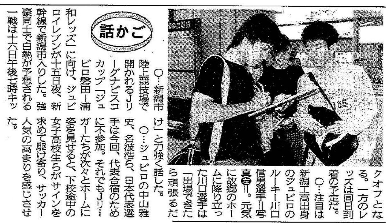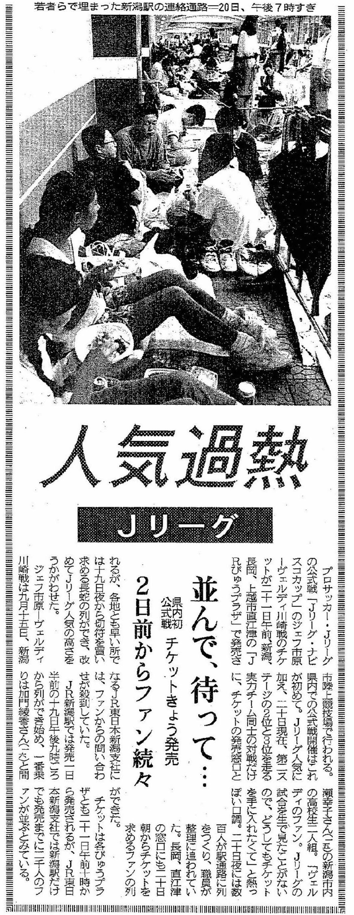 当時の紙面からはJ人気の熱狂ぶりがうかがえる。この試合のチケット欲しさに、販売したJRの窓口には2日前から徹夜組の列ができた。新潟市陸上競技場の約1万5千人という観客数は、1964年の一巡目の新潟国体以来だったという。