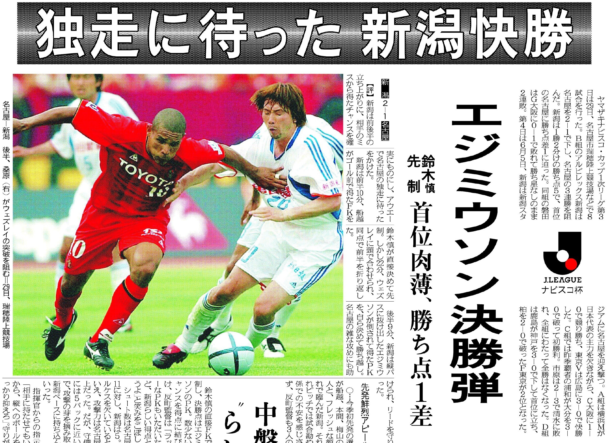 リーグ戦方式の予選の3戦目。シュート数は5対11ながら、鈴木慎吾の直接FKとエジミウソンのPK、ウェズレイに失点を許したものの、少ないチャンスを生かして2-1の勝利。反町康治監督は「新潟らしい得点と思うよ」と笑みをこぼし、名古屋の3連勝を阻んだ。