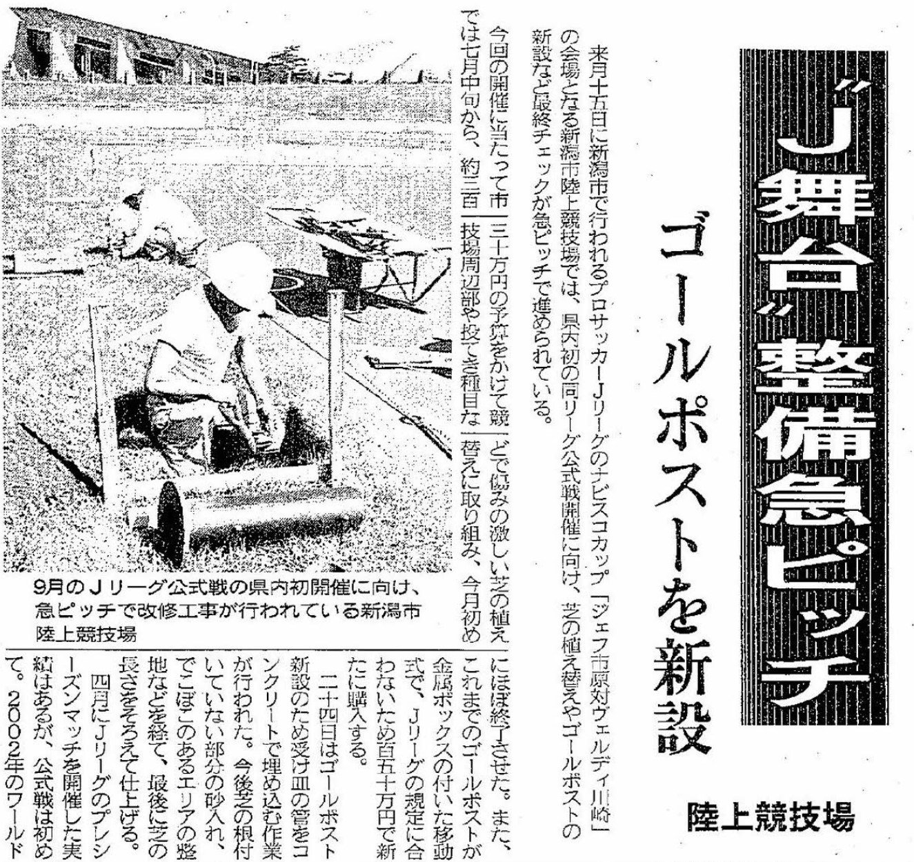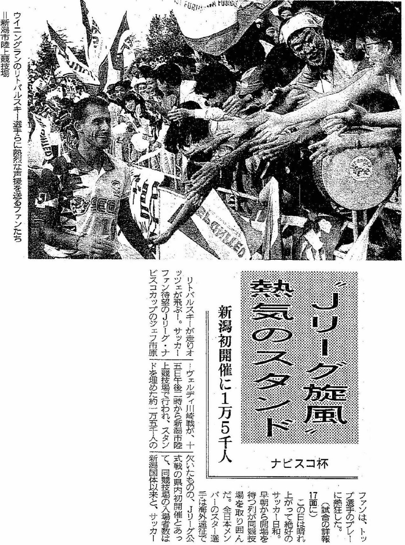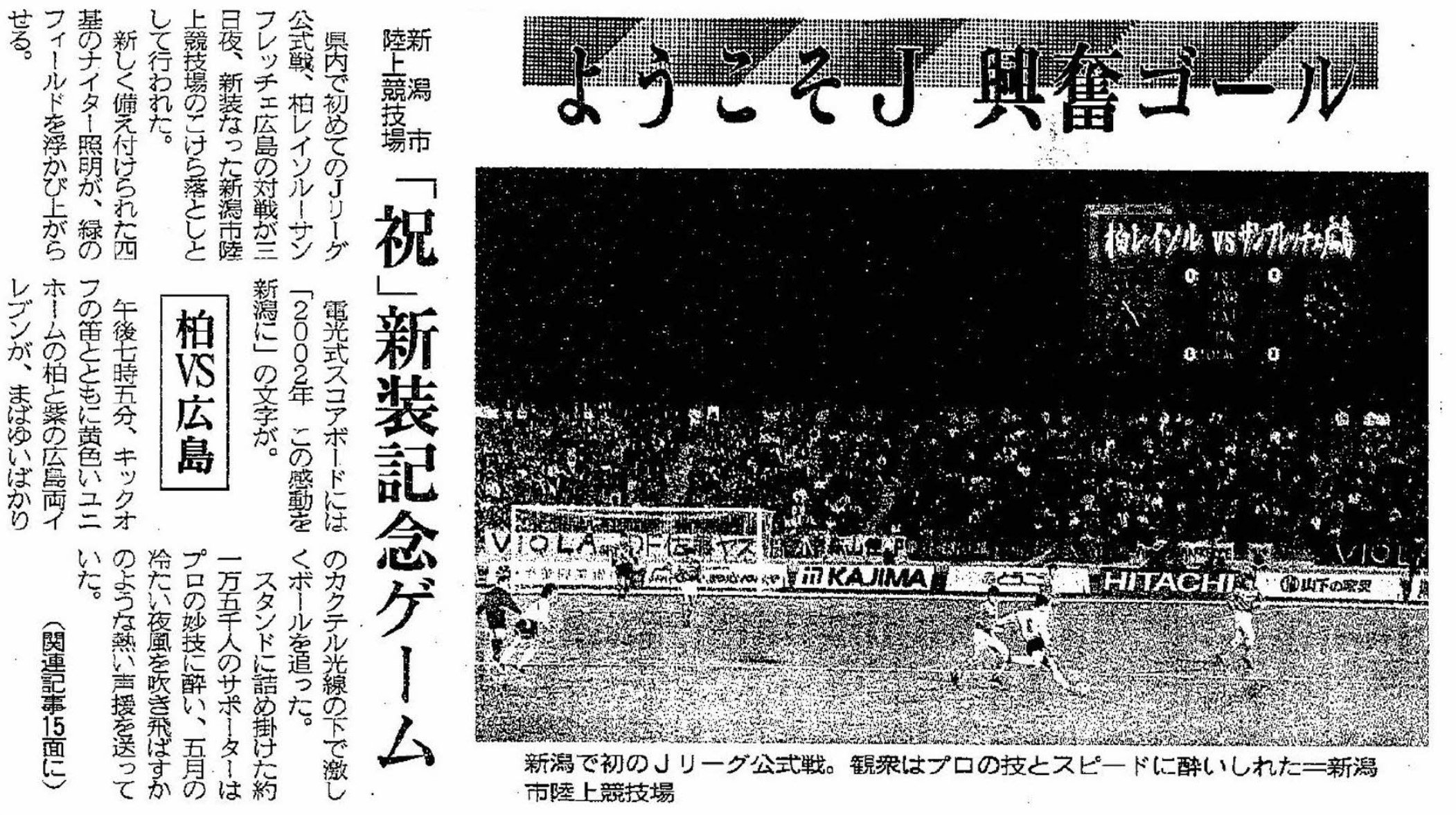 1993年9月16日の新潟日報は、前日の15日、新潟県初のJリーグ公式戦としてJリーグヤマザキナビスコカップ、ジェフ市原(現千葉)―ヴェルディ川崎(現東京ヴェルディ)戦が新潟市陸上競技場で行われたことを伝えた。