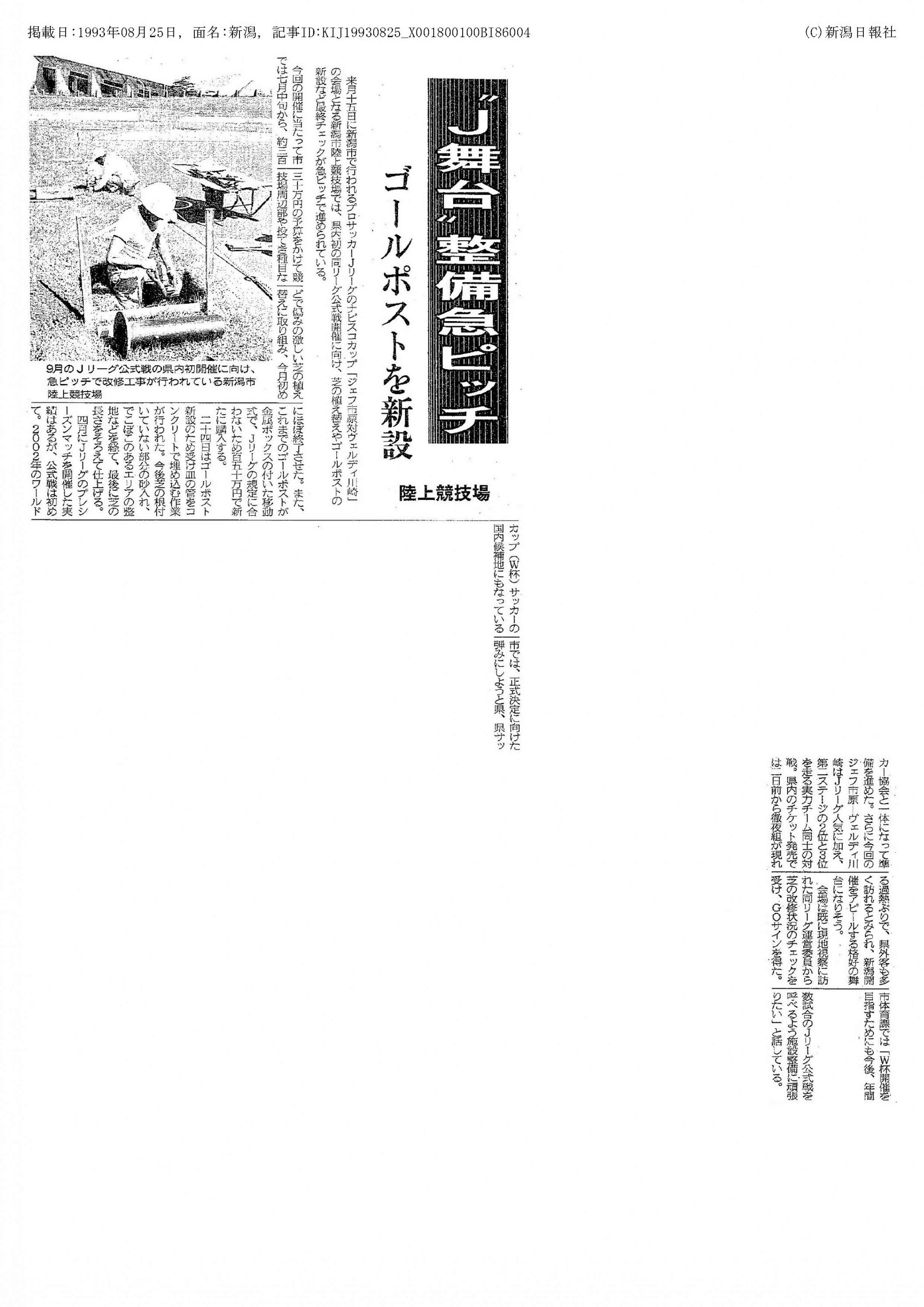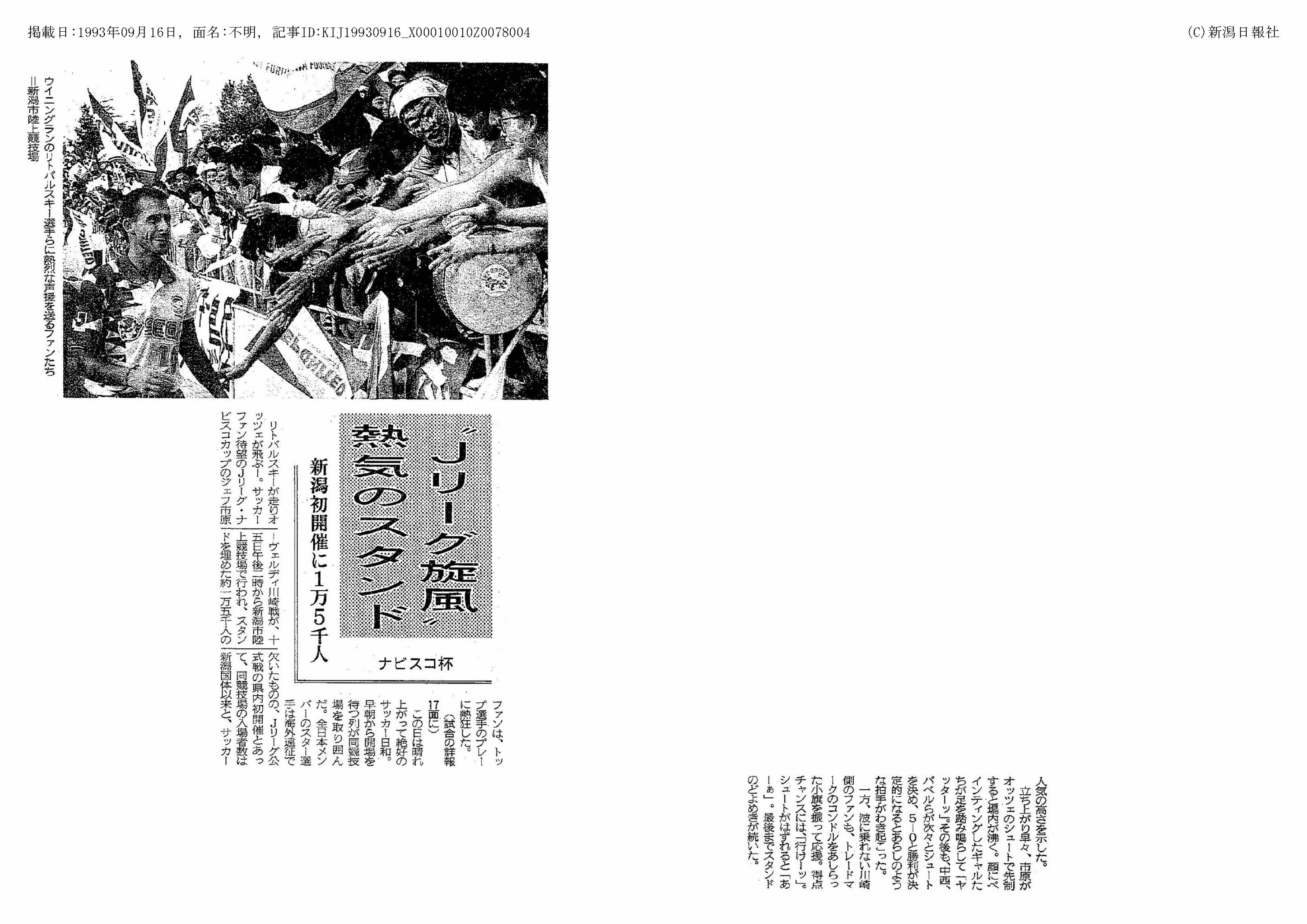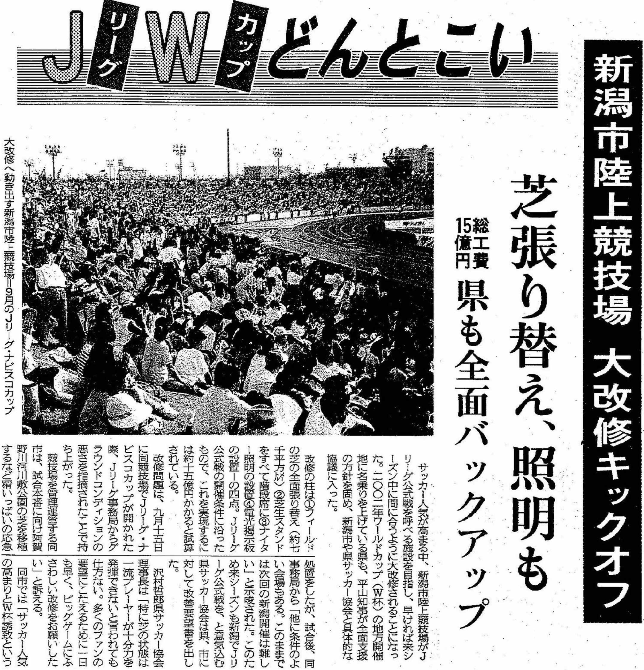 1993年9月16日の新潟日報は、前日の15日、新潟県初のJリーグ公式戦としてJリーグヤマザキナビスコカップ、ジェフ市原(現千葉)―ヴェルディ川崎(現東京ヴェルディ)戦が新潟市陸上競技場で行われたことを伝えた。
