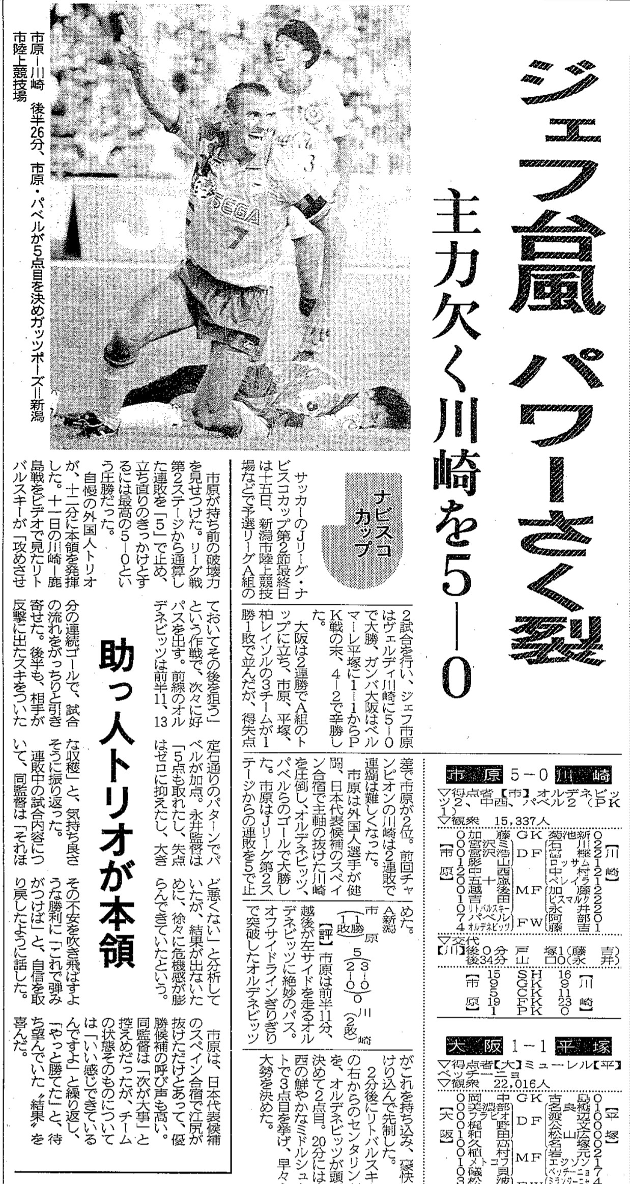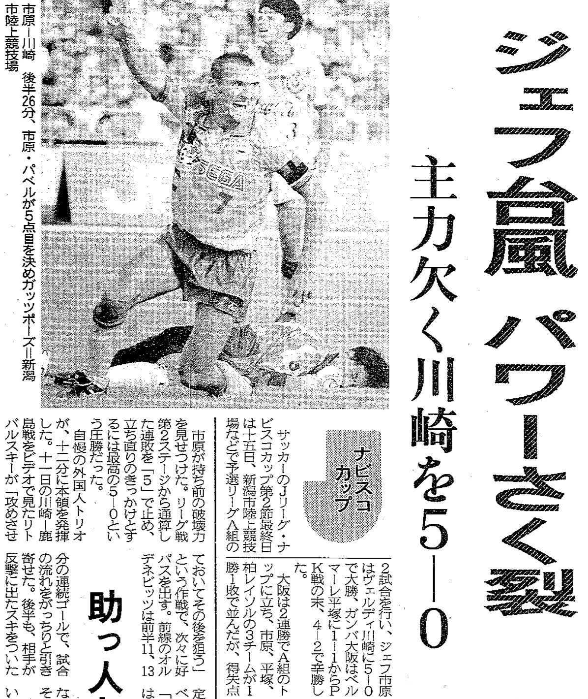 この試合は5-0でジェフ市原が圧倒した。ジェフにはリトバルスキーにオルデネビッツ(オッツェ、1994年Jリーグ得点王)、パベル、中西永輔。現在、新潟に詳しい解説者として知られる宮澤ミシェルもいるが、実はこの試合、二度の警告を受けて退場している。
