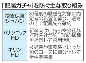 新卒社員が業務や環境が希望通りにならない「配属ガチャ入社後に配属される勤務地や部署が運次第で当たり外れがあるという状況を、開けてみなければ中身が分からないカプセル玩具やソーシャルゲームで課金アイテムを購入する際のくじに例えた言葉。(※ページ下部に詳細)」を理由に早期離職するのを防ぐ取り組みが大手企業で広がっている。損害保険ジャパンは...
