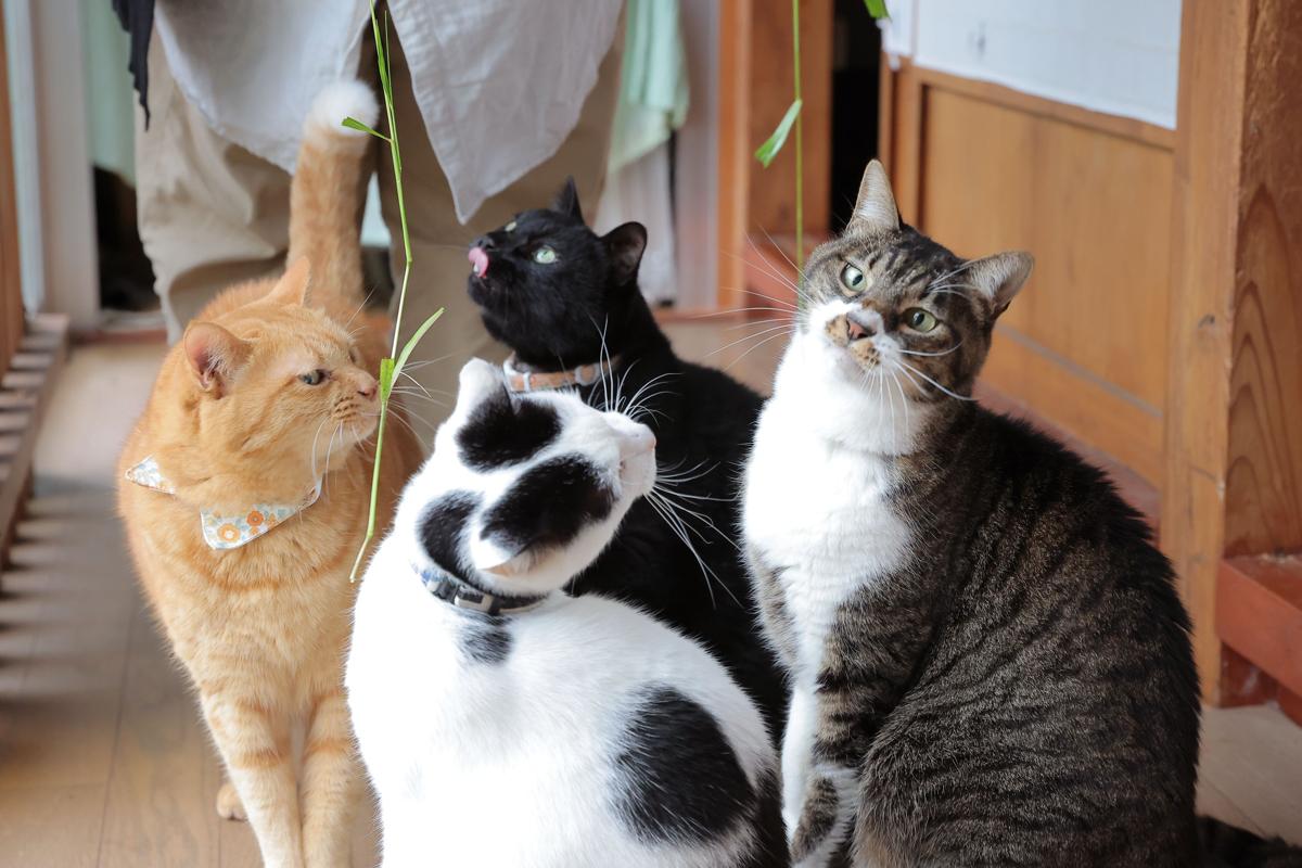 居間に入ると、さっそく猫たちがやってきた。その数全部で7匹。体格の良い猫が多く、どこを見てもモフモフだらけ。なでる手が足りない。思わずテンションが上がる。