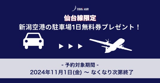 新潟拠点の地域航空会社トキエア株式会社(本社:新潟県新潟市 代表取締役:長谷川政樹、以下トキエア)は、新潟空港を出発地とし「新潟=仙台」線に搭乗するお客様を対象に、新潟空港駐車場の1日無料券をプレゼントするキャンペーンを開始します。