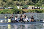 息の合ったオールさばきで阿賀野川をローイングする「良い会」メンバー=阿賀町