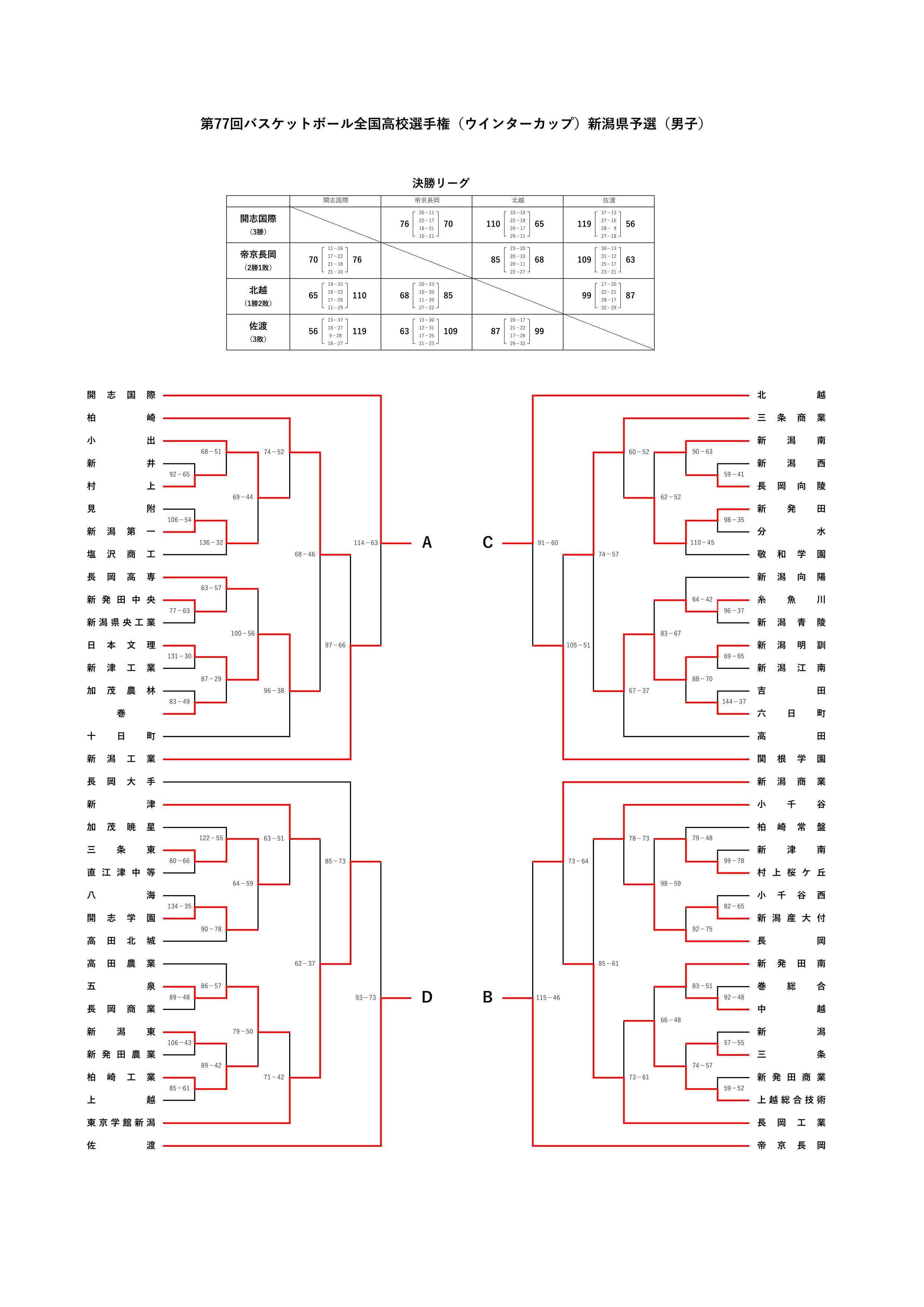スポーツ 中学・高校 勝ち上がり表 第77回バスケットボール全国高校選手権(ウインターカップ)新潟県予選(男子) 2024/11/1 7:00 (最終更新: 2024/11/4 16:32) PDFで勝ち上がり表を見る ... トップページで最新情報を見る 関連ニュース [フィギュアスケート]冬季五輪へシーズン本格化、シニア参戦の... 10/13 [全国高校ラグビー・新潟県大会2025]長岡、下越合同(新発... 10/13 [サッカー・全国高校選手権新潟県大会]北越、新潟明訓などが3... 10/11 [サッカーU18プレミアリーグ]帝京長岡高、インターハイ王者... 10/11 [滋賀国スポ2025]新潟県の総合順位は28位、2016年以... 10/8 [滋賀国スポ2025]成年女子800メートル、山田はな(わら... 10/7 [滋賀国スポ2025]カヌー成年女子スプリント・カナディアン... 10/6 [滋賀国スポ2025]陸上・少年女子A100メートルで秋澤理... 10/5 [滋賀国スポ2025]陸上・少年男子A300mの佐藤克樹(東... 10/4 [サッカーU18プレミアリーグ]帝京長岡高、0-7で鳥栖U-... 10/4 [滋賀国スポ2025]陸上・成年男子砲丸投げの渡辺豹冴(新潟... 10/3 [滋賀国スポ2025]レスリング成年男子グレコ77キロ級、本... 10/2 特集・連載 [新潟県の地域別感染症情報]警報発令中のりんご病、前の週より... 10/16 【高校入試・新潟】最新情報&お役立ち情報まとめ 倍率・過去問も 7/28 漫画で知る「うつ病」とは? 若手社員が休職→通院→復職するま... 6/13 [紅葉スポット×花スポット]新潟県内の紅葉や花畑、映える名所... 5/29 【猫動画あり・新作追加】新潟県内「猫のいる店」♡モフモフに触... 8/27 [WEリーグ]今からでも間に合う!アルビレックス新潟レディー... 8/14 【機動戦士ガンダムジークアクス】鶴巻和哉監督(五泉市出身)が... 8/4 [プロ野球ドラフト会議]プロ志望届、新潟県関係は7人が提出!... 10/9 Otona+ 卵子提供で2児出産、自助グループ立ち上げ当事者に寄り添い…芸... 10/14 山頂に神社、小学校の屋上…各地に点在する「三角点」って?形は... 9/30 「アクシアル」「コメリ」などプライベートブランド開発の裏側お... 9/23 柏崎刈羽原発巡る県民投票、今も望む声やまず…首長らとの「意思... 9/16 【動画あり】猫と人がより幸せに暮らすには?保護猫と新たな飼い... 9/2