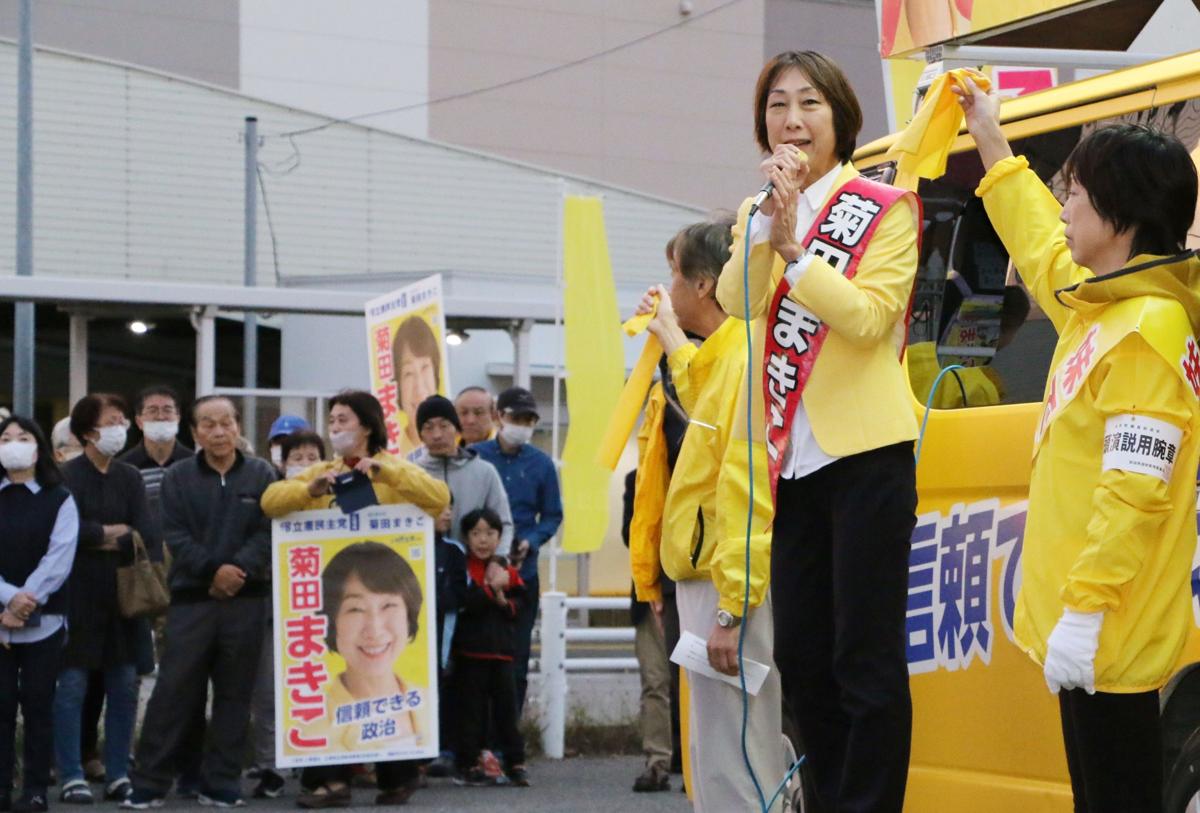 イメージカラーの黄色い布を手に、沿道数十メートルに渡って並ぶ支援者たち。中には「裏金ダメ」のプラカードも見える。選挙戦最終日の10月26日夕、立憲民主党の菊田真紀子(55)が新潟市西区青山で演説した。人や車が行き交う交差点は陣営の熱気が充満していた。