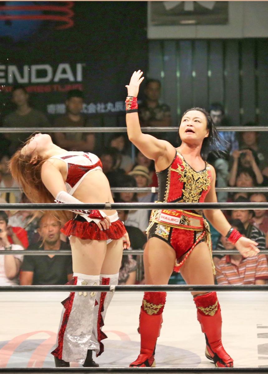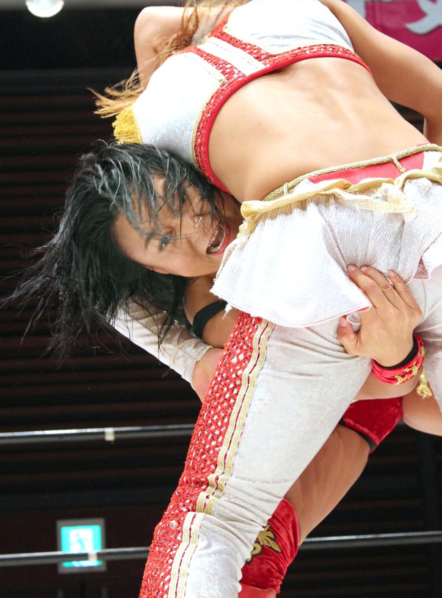 旗揚げ戦のメインイベントの相手はアジャコングさんだった。正統派ベビーフェース(善玉)の里村さんに対し、典型的なヒール(悪役)のアジャさん。里村さんの持ち味の一つである「受け」のうまさは、抜群のパワーで攻めるアジャさんを相手にしてこそ輝く。この日も脚を負傷して追い込まれながら、最後に逆転の大技を決めて仙台のファンを喜ばせた。