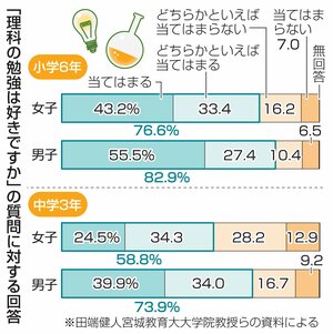 社会 学校 理数系が好きな女子は少なめ?正答率は男女ほぼ同じなのに… 全国学力テスト分析、専門家は「理数離れ」懸念 2024/11/10 18:00 小学6年と中学3年を対象にした全国学力・学習状況調査(全国学力テスト)の結果分析で、理科や算数・数学の正答率に男女差はほぼないのに、理数系科目が「好き」と答えた児童生徒の割合は、小中とも女子が男子より... 残り603文字(全文:704文字) ここから先を読むには 続きを読む(会員登録する) 続きを読む(ログイン) 新潟日報朝刊を購読していますか? はい いいえ トップページで最新情報を見る 関連ニュース 新潟国際情報大、越智敏夫学長を再任 2026年4月から2期目 19:00 若者の視点でビジネス提案!佐渡総合高校2年生が課題解決型イン... 15:30 お世話した2頭とお別れ…山古志のアルパカ元気でね!見附市・葛... 15:00 高温・乾燥に強いコメ開発へ…新潟大学が2026年度新施設整備... 10:30 長岡市中心部のビル改修に楽しいアイデア満載…新潟大学付属長岡... 12/16 長岡市の中学校・休日部活動「地域移行」3カ月、生徒・指導者数... 12/16 アルビ退団の堀米悠斗選手、モチベーションを上げる秘けつは…南... 12/16 県立高校再編の遅れが起こした“逆転現象”…3学級以下の小規模... 12/16 ジオパーク通じ県内小学生がオンライン交流♪佐渡・両津小、糸魚... 12/15 未来を切り開く子ども育てるには…新潟市で「特色ある教育実践」... 12/15 新潟水俣病を学び「同じ過ち繰り返さないために」新潟市東区・下... 12/15 運動会が半日に?スキー授業廃止も…学校行事縮小に募る保護者の... 12/15