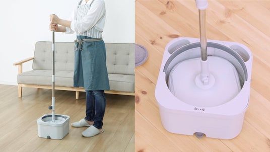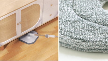 また、モップ部分は、棚やソファーの下など狭い場所もラクに掃除ができる薄型を採用。吸着性に優れたマイクロファイバー生地を使用しているため、汚れを簡単にふき取ります。その後は、バケツ内のブラシが髪の毛やゴミをかき取るので、モップからゴミを取り除く手間がかかりません。さらに、バケツ下部には排水口が付いており、汚れた水を簡単に排水できます。