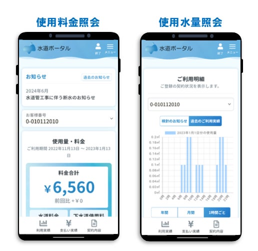 現行の紙による水道料金及び水道使用量のお知らせをWebによる通知で行うもので、過去の水道使用推移や支払状況を視覚的に把握できる水道業務のDXを推進するサービスです。