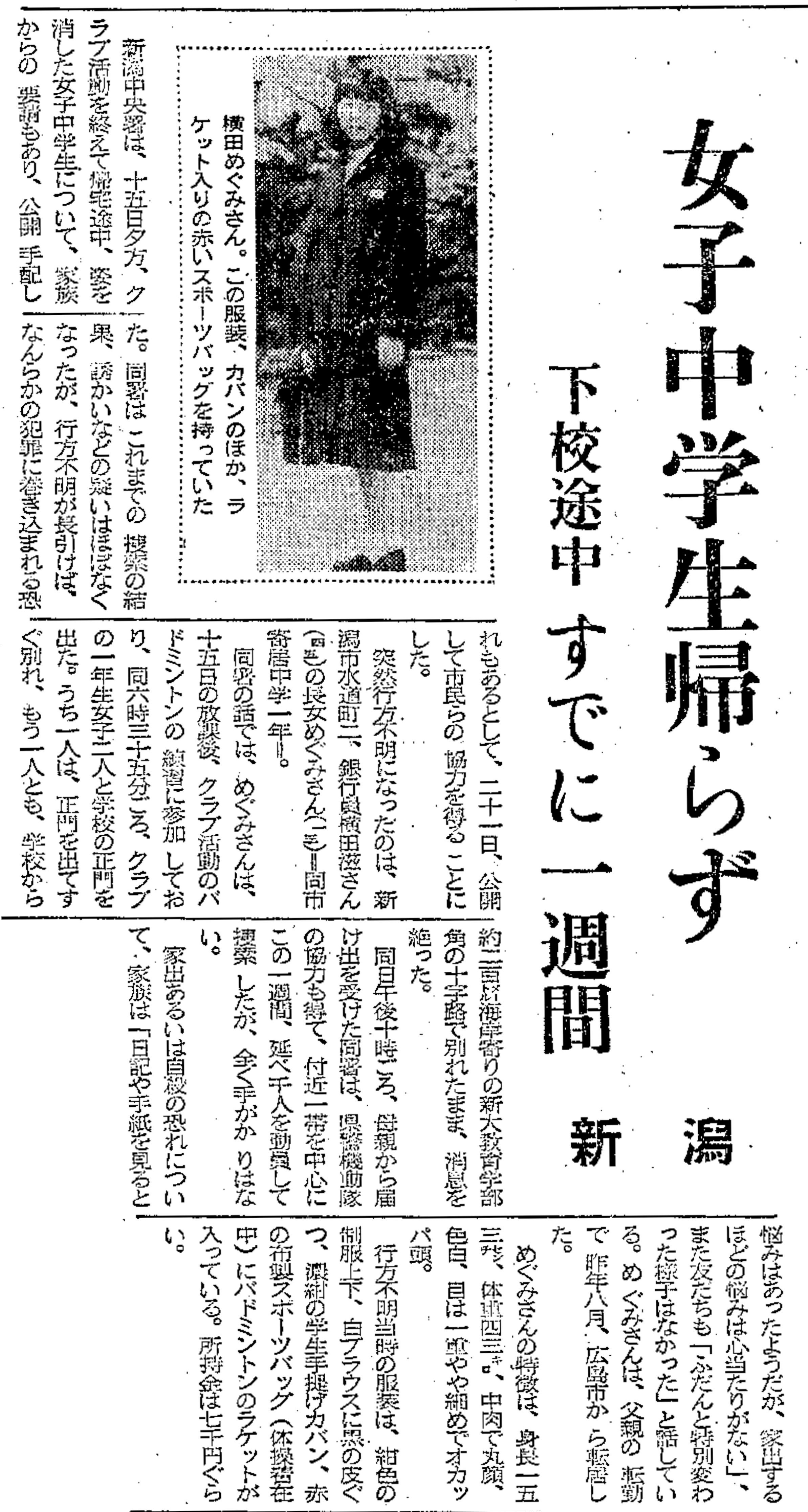 1977年11月15日午後6時半ごろ、めぐみさんはバドミントン部の練習を終えて下校。友人と別れ、自宅に向かう途中で消息を絶ちました。新潟日報は公開捜査となったことを受け、22日付で第一報を伝えました。