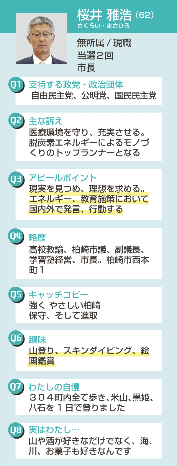 新潟県柏崎市の柏崎市長選挙(市長選)が11月10日告示され、現職1人と新人2人が立候補しました。立候補を届け出たのは、いずれも無所属で、自営業の新人・阿部由美子さん(62)、3選を目指す現職・桜井雅浩さん(62)、燕市在住で会社員の新人・野本祐二さん(58)です。投票日は11月17日で、その日のうちに開票されます。