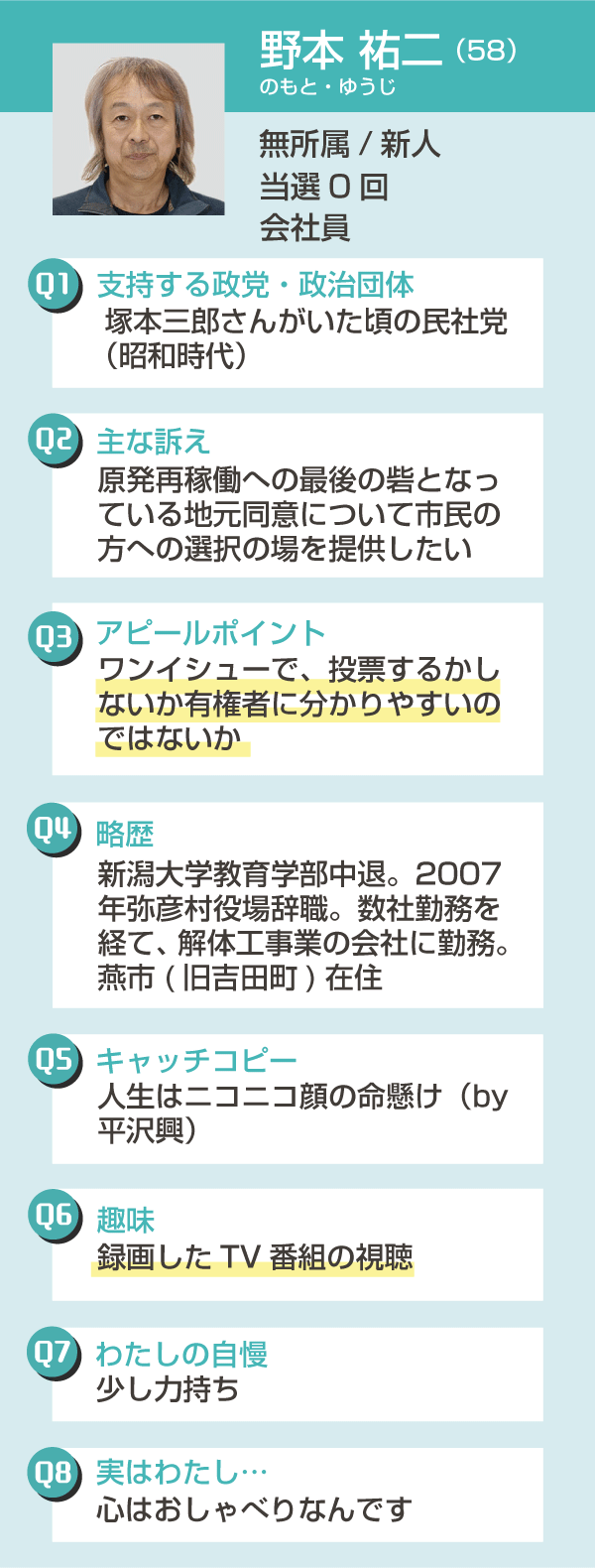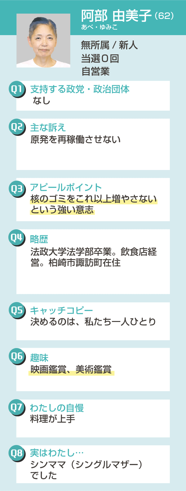 立候補者3人の訴えやアピールポイント、略歴、趣味などを「カード」にまとめました。届け出順に紹介します(図中は敬称略)。