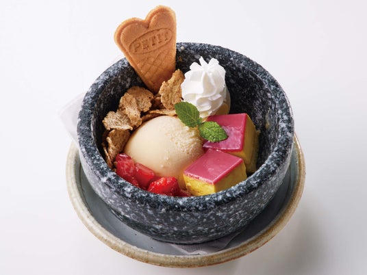 よく冷やした石鍋でバニラアイスや安納芋のケーキトッピングを混ぜ合わせていただくデザートです。安納芋の優しい味わいがお楽しみ頂けます。