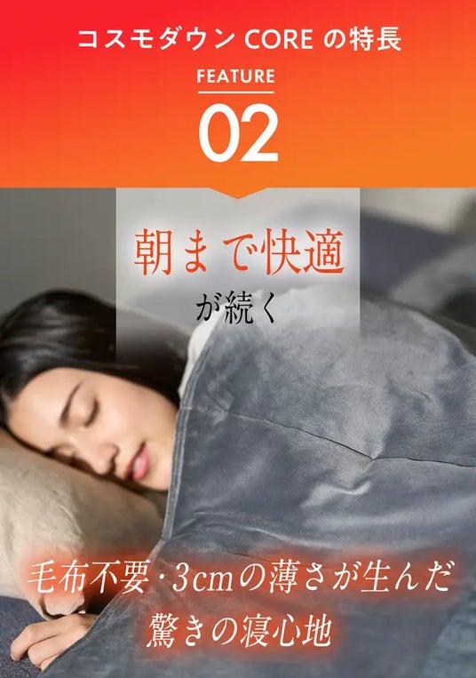 FEATURE02 朝まで快適が続く。毛布不要・3cmの薄さが生んだ驚きの寝心地