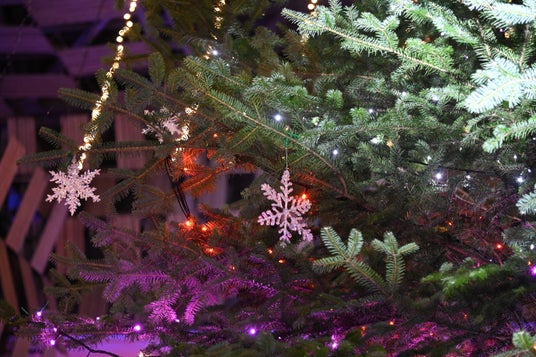 廃材を再生させたオーナメントとシャンパンゴールドのライトで彩り、華やかさとぬくもりを感じさせながら光り輝きます。