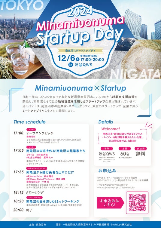 2024年12月6日(金)、Socialups株式会社(本社:新潟県新潟市中央区、代表取締役社長:高瀬 章充)は、渋谷スクランブルスクエア(渋谷駅直結)15階「渋谷QWS」にて南魚沼市主催の『Minamiuonuma Startup Day 2024』を運営します。昨年に引き続き、南魚沼市の魅力や起業家支援の取り組みをPRするこのイベントでは、首都圏のビジネスリーダーやスタートアップ関係者を対象に、新たなビジネスチャンスや交流の場を提供します。南魚沼・新潟に関心、ゆかりのある皆様のご参加をお待ちしております。