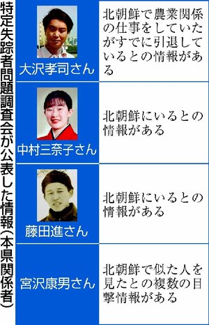 1965年3月に糸魚川市で失踪した藤田進さん=失踪当時(17)、糸魚川市=も「北朝鮮にいる」という情報がある。60年9月に東京で行方が分からなくなった宮沢康男さん=同(17)=は「北朝鮮で似た人を見た」との情報が複数ある。