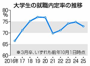 厚生労働、文部科学両省は、2025年春の卒業予定で就職を希望する大学生の10月1日時点での内定率が、前年比1・9ポイント減の72・9%だったと発表した。新型コロナウイルス感染拡大の影響で落ち込んだ2020年(21年3月卒)以来4年ぶりの減少となったが、1996年の調査開始以降では7番目に高く、厚労省の担当者は「人手不足を背景に依然として高い水準だ」としている。