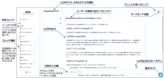 - 用途に応じてChatGPT(Azure OpenAI Service)、コード生成に特長のあるClaude、Web検索に特化したPerplexity AIなどの大規模言語モデルLLMを選択可能