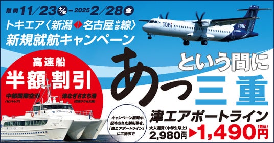 新潟拠点の地域航空会社トキエア株式会社(本社:新潟県新潟市 代表取締役:長谷川政樹、以下トキエア)は、2024年9月27日「新潟=名古屋(中部)」線を新規就航したことを記念したキャンペーンを開始します。本キャンペーンでは、中部国際空港から伊勢志摩(三重県)に行くのに便利な高速船「津エアポートライン」片道半額券を、新潟発・名古屋着ご搭乗のお客様に機内にてご提供させて頂きます。