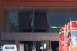 改修工事現場で爆発事故があった、弥彦総合文化会館。爆風の影響か、玄関のガラスが割れていた=6月29日、弥彦村弥彦