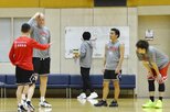 練習中言葉を交わす、バスケットボール男子日本代表の富樫勇樹(左)と渡辺伶=11月20日、宇都宮市の日環アリーナ栃木