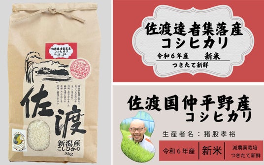 新潟県佐渡市 令和6年産新米「佐渡達者集落産コシヒカリ」(左)、産地はラベルシールで表示(右2点)