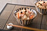 ➂ Aの調味液と水(分量外)を合わせて390ccになるように計量して混ぜ、鍋に入れる。そこに米を入れて表面をならし、サツマイモ、シメジ、ベーコンを米の上にのせ、さらにバターをのせる。