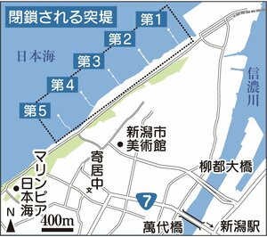 新潟市中央区にある新潟港海岸(西海岸地区)の突堤が、12月1日から閉鎖される。新潟県新潟地域振興局新潟港湾事務所によると、閉鎖は2025年4月末までの予定。