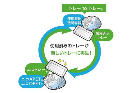 「トレーtoトレー」とは店頭で回収された使用済み食品トレーを新たな食品トレーに生まれ変わらせる、エフピコ方式のリサイクルの名称を指します。