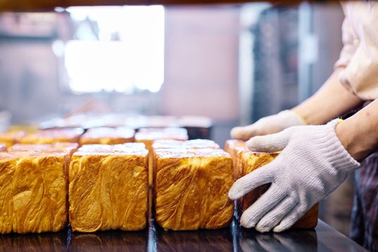 キューブ型の可愛いらしいデニッシュパンをカットした断面を見てみると、生地とバターの層が美しいマーブル模様になっています。これは、何度も折りたたみ何層にも重なった生地を、三つ編み状に編み込んで焼型に入れるためです。