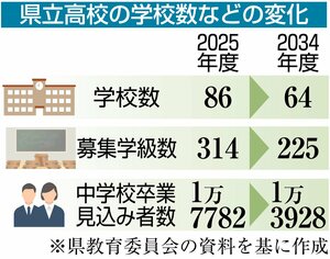 県全体の募集学級数は、34年度に225学級となり、25年度の314学級から89学級減る見込み。