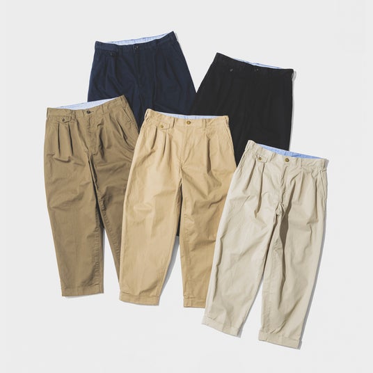 ロングセラーのワイドチノパンツ。ルーズすぎない上品な雰囲気とリラックス感を両立し、どんなトップスでも合わせやすいパンツです。腰回りにゆとりを持たせた2プリーツ、クラシックな印象のウォッチポケット、やや短めの丈と、裾を折り上げたターンアップ仕様が特徴です。