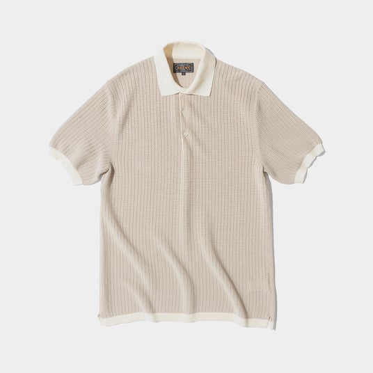 和紙をポリエステルと合わせた撚糸を使用した、14ゲージニットポロシャツ。麻のような独特なシャリ感と、毛羽立ちの少ない清涼感のある肌触りが特徴。軽量で汗じみや臭いも気になりにくく、さらっとしてべたつかず肌ストレスも少ない、夏に適したポロシャツです。