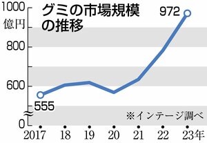 インテージ(東京)の調査では、グミの販売金額は年間500億〜600億円で推移してきたが、21年以降は前年比10%以上の伸びが続き、23年には972億円に達した。世代別では、30代と40代の男性の購入金額が大きく伸びているという。21年にはガムを上回り、差を広げている。