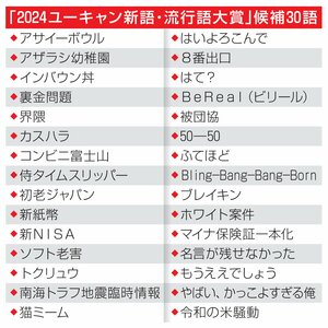 社会 いくつ分かる?2024新語・流行語大賞、候補に「裏金問題」や「50-50」「はいよろこんで」など30語 2024/11/5 22:00 (最終更新: 2024/12/4 0:52) 「現代用語の基礎知識選 2024ユーキャン新語・流行語大賞」の候補30語が11月5日発表され、「裏金問題」や「50-50」が入った。「ホワイト案件」や「新NISA」も含まれ、選考委員会は「お金にまつわる用語が多かった」... 残り559文字(全文:669文字) ここから先を読むには 続きを読む(会員登録する) 続きを読む(ログイン) 新潟日報朝刊を購読していますか? はい いいえ トップページで最新情報を見る 関連ニュース 「全国山・鉾・屋台保存連合会」理事の加藤悦郎さん(村上市)に... 12/10 新潟県内の私立大13校が定員割れ、2025年度定員充足率89... 12/10 県外産キノコを“新潟産”と偽り販売…新潟市南区「中山食茸」に... 12/10 梅谷守衆院議員の不起訴は「相当」と議決、新潟検察審査会「裁定... 12/10 [新潟県の天気・気象情報]12月11日夕方から夜遅くに落雷や... 12/10 [イノシシ目撃情報]上越市(12月10日) 12/10 花角英世知事の判断について滝沢亮・三条市長「プロセス含め尊重... 12/10 「DIY!!」で“三条推し!!”CF、生誕祭…川崎市から年1... 12/10 「佐渡島の金山」の歴史や観光、堂々発表 佐渡市・相川小で「全... 12/10 「大切な命を守る」全国中学・高校生作文コンクール、新潟高2年... 12/10 人口減少社会の地域おこしとは?新潟産業大学で「柏崎学シンポジ... 12/10 「分身ロボット」通し接客挑戦、社会参加への一歩に!長岡市がひ... 12/10