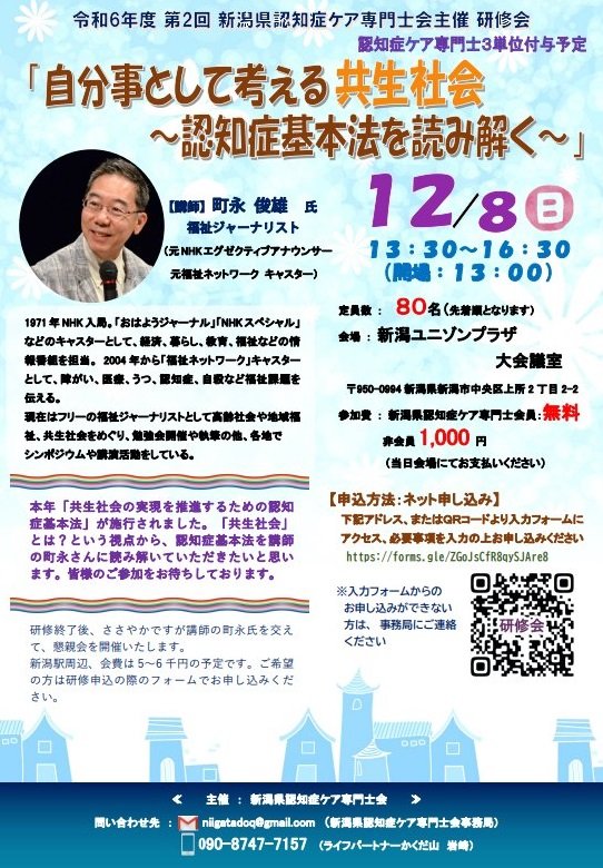「自分事として考える共生社会~認知症基本法を読み解く~」と題して開催。元NHKエグゼクティブアナウンサーで、福祉ジャーナリストの町永俊雄さんが講師を務める。先着80人。事前に申し込みが必要。問い合わせは、090(8747)7157。