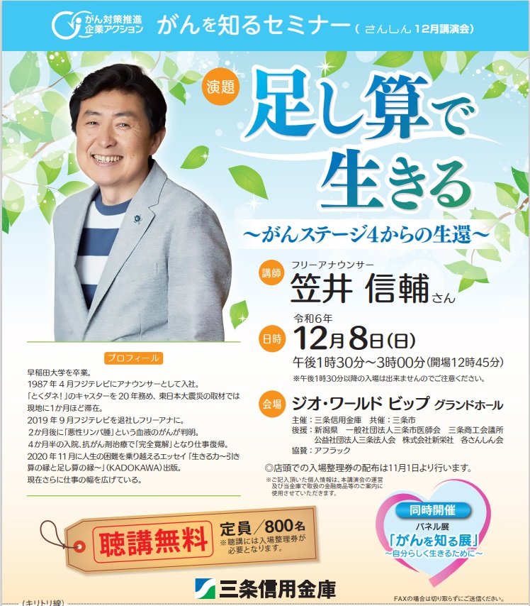 悪性リンパ腫を経験したフリーアナウンサーの笠井信輔さんが「足し算で生きる~がんステージ4からの生還~」と題して講演する。定員800人。三条信用金庫の各店で配布している入場整理券が必要。三条信用金庫、0256(34)3474。