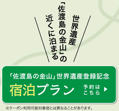 ・「佐渡島の金山」の世界遺産登録を記念して、佐渡をはじめとする、新潟ならではの味覚を楽しめる宿泊プランなど、県内の宿泊事業者が造成した記念宿泊プランを販売します。