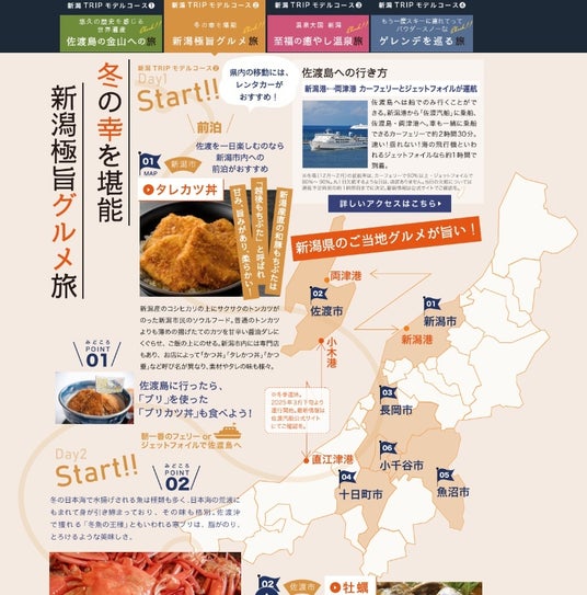 ・宿泊予約サイト内に新潟県特集ページを掲載し、「佐渡島の金山」の情報発信をはじめ、食や温泉など、佐渡を含めた県全体の秋冬の魅力及び県内周遊モデルコースを掲載します。