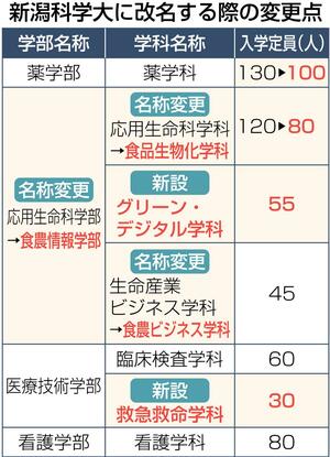 新潟薬科大(新潟市秋葉区)が2027年度に、大学名称を「新潟科学大学」に変更する計画であることが3日、関係者への取材で分かった。合わせて、情報系の専門人材を育成する「グリーン・デジタル学科」や、救急救命士の資格取得を目指す「救急救命学科」を新設するなど、学部学科構成も大きく変える。26年春に文部科学省に届け出る予定。杉原多公通(たくみち)学長は「大学規模は変えずに学問領域を文系まで大きく広げ、多様な学びが可能な総合大学に転換する」としている。